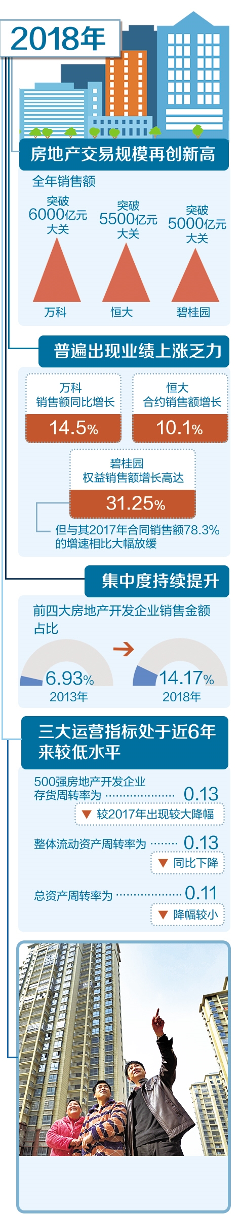 2018年,房地产交易规模再创新高,万科、恒大、碧桂园全年销售额纷纷突破6000亿元、5500亿元、5000亿元大关。但在调控政策从紧的环境下,房企普遍出现业绩上涨乏力现象。年报显示,2018年万科销售额同比增长14.5%,恒大合约销售额增长10.1%,增速同比均有所放缓。虽然2018年碧桂园权益销售额增长高达31.25%,但与其2017年合同销售额78.3%的增速相比亦大幅放缓。