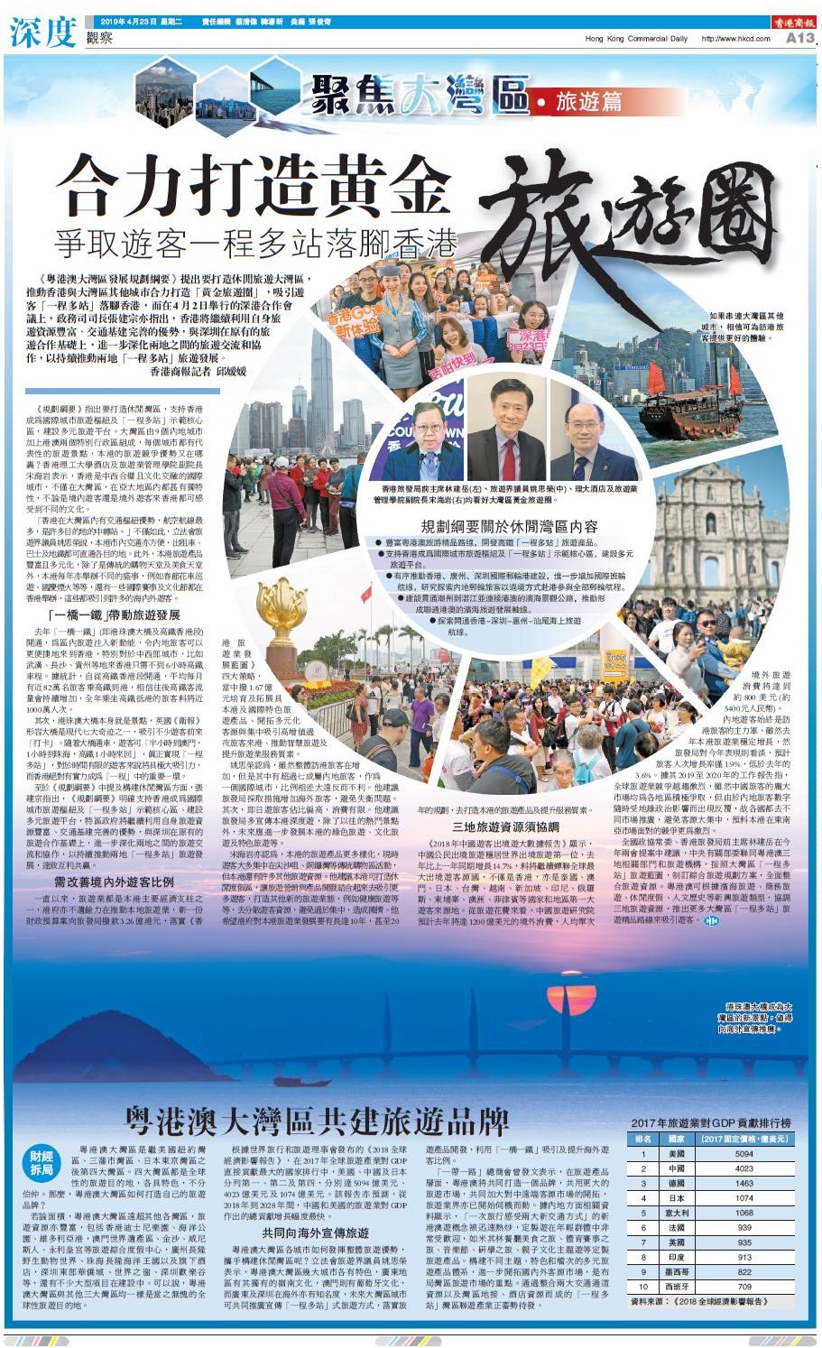 【香港商报网讯】《粵港澳大灣區發展規劃綱要》提出要打造休閒旅遊大灣區,推動香港與大灣區其他城市合力打造「黃金旅遊圈」,吸引遊客「一程多站」落腳香港,而在4月2日舉行的深港合作會議上,政務司司長張建宗亦指出,香港將繼續利用自身旅遊資源豐富、交通基建完善的優勢,與深圳在原有的旅遊合作基礎上,進一步深化兩地之間的旅遊交流和協作,以持續推動兩地「一程多站」旅遊發展。香港商報記者 邱媛媛