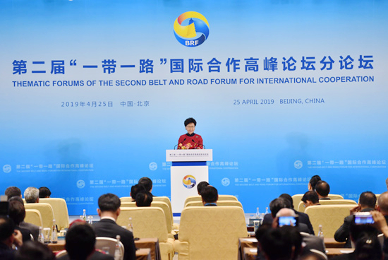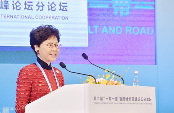 特首林鄭月娥在第二屆「一帶一路」國際合作高峰論壇資金融通分論壇開幕式作主旨發言。政府新聞處