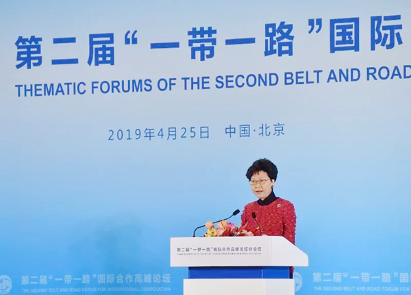 當天,林鄭月娥分別在「地方合作」和「資金融通」分論壇開幕式作主題發言。她於資金融通分論壇表示,「一帶一路」是一個推動全球變革發展的願景。作為擁有「一國兩制」優勢和完善國際聯繫的中華人民共和國特別行政區,香港致力在此倡議中發揮積極作用。觀乎香港全球金融中心地位,她認為,香港最能服務國家所需的最大所長正是金融服務。