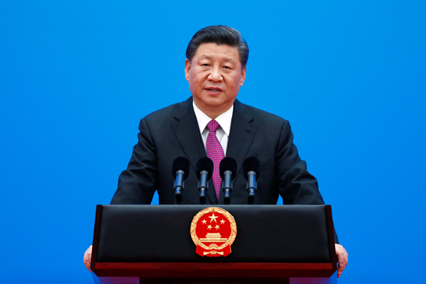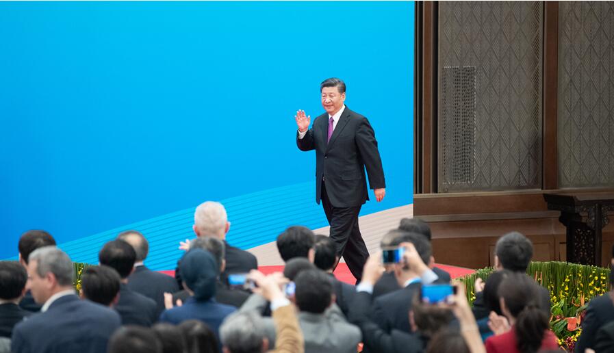 4月27日,圆桌峰会闭幕后,习近平会见中外记者,介绍第二届「一带一路」国际合作高峰论坛圆桌峰会情况和主要成果。这是习近平步入记者会现场。 新华社