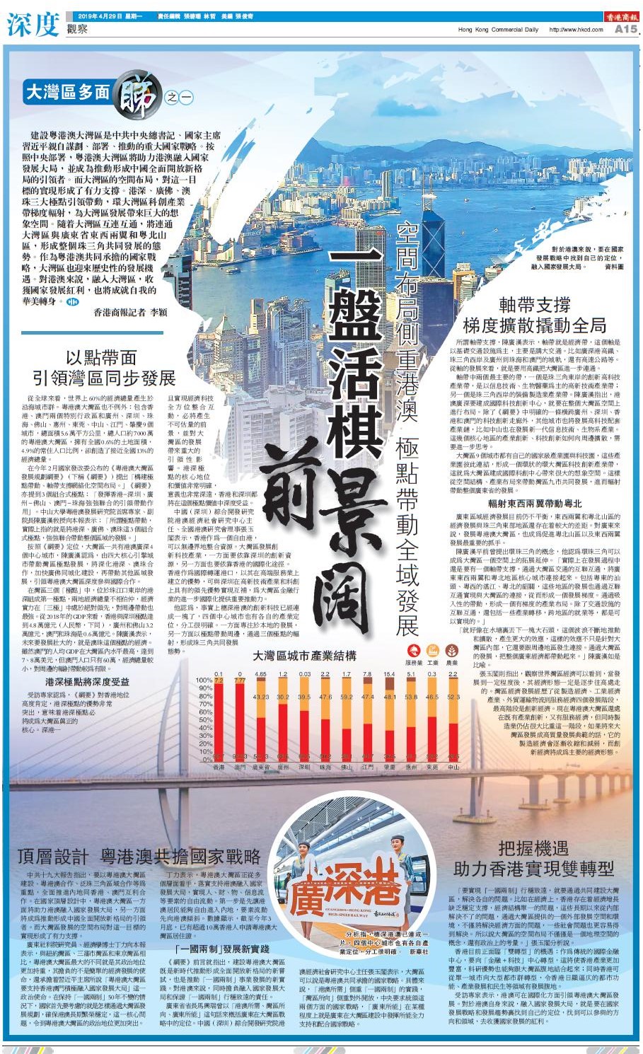 香港目前正面臨「雙轉型」的機遇:作為傳統的國際金融中心,要向「金融+科技」中心轉型,這將使香港產業更加豐富,科研優勢也能夠跟大灣區腹地結合起來;同時香港可從單一城市向大型都市群轉型,令香港日顯逼庂的都市功能、產業發展和民生等領域有發展腹地。