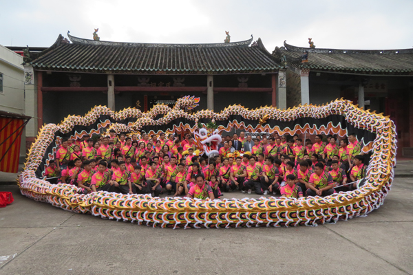 屏山鄧氏宗祠外,新打造的金龍與舞龍隊員留下歷史一刻。
