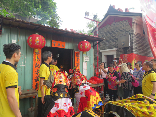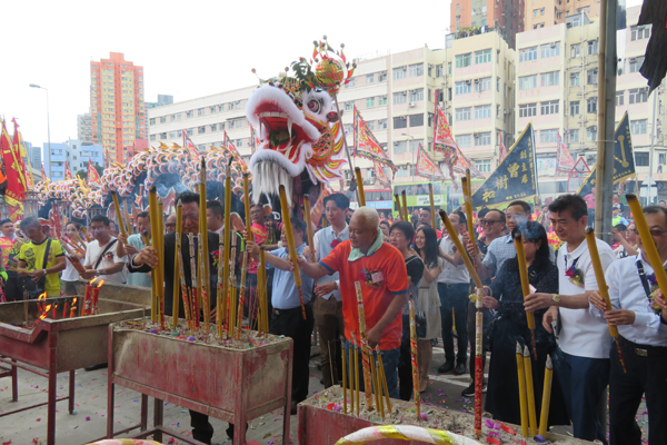 官紳前來參拜,橙衣左邊者為元朗區議會主席沈豪傑,鄧志強(前左一)正在上香。