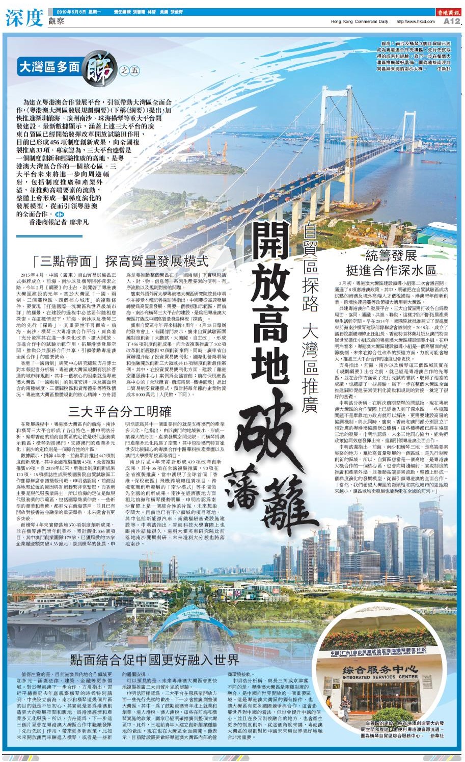 廣東外語外貿大學粵港澳大灣區研究院院長申明浩在接受本報記者採訪時指出,中國要從高速發展轉變為高質量發展,需要一個模板和示範區,而前海、南沙和橫琴三大平台的建設,是為把粵港澳大灣區打造成中國高質量發展模板「探路」。