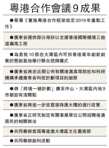 林鄭表示,特區政府歡迎廣東省已落實鼓勵港澳青年到大灣區內地9市創新創業、將於近期公布關於港澳高校和科研機構參與廣東省科技計劃的細節、擴大海關跨境快速通關對接項目(即「跨境一鎖計劃」)的實施範圍,以及正研究制定廣東省事業單位公開招聘港澳居民的實施安排。至於其他措施,包括公布當地政府為境外(包括香港)人才提供個人所得稅稅負差額補貼的高端人才和緊缺人才的定義、開展粵港澳大灣區出入境便利化改革試點,以及便利港澳車輛進出內地口岸等,雙方同意盡快落實執行。