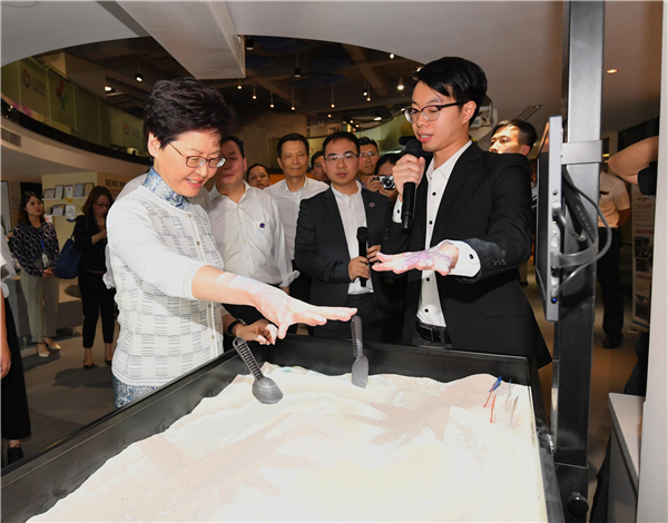 林鄭月娥昨在佛山參觀粵港澳科技展示交流中心設施並與中心內的創業人士交流。政府新聞處