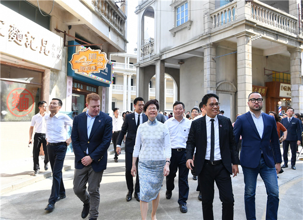 其後,林鄭一行前往西樵山國藝影視城,了解當地扶持影視產業發展的政策措施。西樵山國藝影視城是香港上市公司投資項目,提供頗具規模的影視拍攝場地,包括數十年前的香港舊街景和其他不同地方的場景,每年亦會引入海外電影和海外連續劇於該處拍攝。此外,影視城亦是集電影拍攝場地主題樂園、酒店、表演場館於一身的觀光和遊玩設施。林鄭表示,特區政府去年發表的《施政報告》中提出多項措施,其中就包括支持香港電影業發展,加上中央有關部委上月同意進一步便利香港電影業界進入內地市場的措施,配合如影視城硬件設施,相信香港電影大有發展空間。