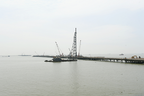 記者登臨深中通道的中山登陸點,舉目遠眺,兩座臨時搭建的施工便橋從岸邊一直向遠方延伸,勾勒出深中通道橋樑部分飛架江面的建設軌跡。自2016年12月28日,深中通道項目先行工程西人工島開工建設以來,目前,深中通道橋樑工程已經全線展開,伶仃洋大橋東錨碇已完成圍堰築島及回填;島隧工程方面,西人工島順利完成築島,島上隧道敞開段開始施工,東人工島堰築段隧道圍堰工程及成島施工已展開,沉管隧道預計今年完成E1、E2管節鋼殼製造和澆築,浮橋旁一組組巨大橋墩正在加緊施工。
