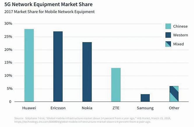 目前在全球範圍內,有4家佔據主導地 位的5G電信設備製造商分別為:華為、 愛立信、諾基亞、中興。歐洲兩家,中 國兩家,三星排第5,沒有一家美國的。