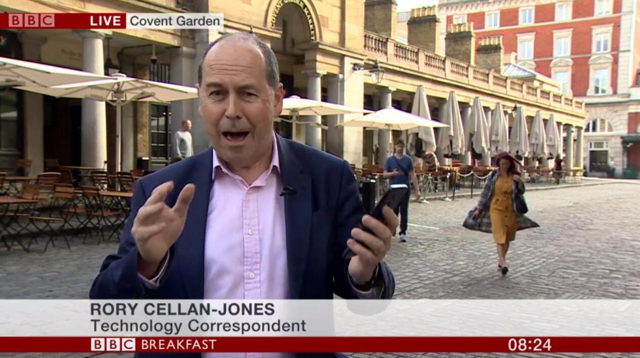 61歲的BBC 科技記者Rory Cellan-Jone正在進行直播的畫面。