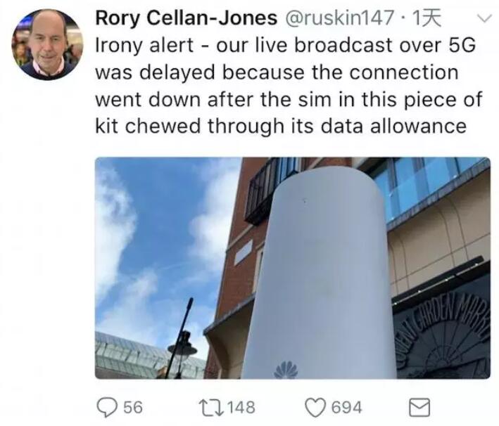 Rory稱直播一度因連接問題遭到推遲,他發推特解釋說,由於測試5G直播時,華為5G流量太大而超出設備內EE提供的Sim卡流量上限,可謂「措手不及」,因此不得不往卡裏再充流量保證直播進行。