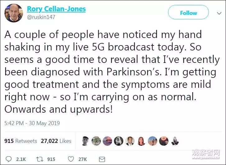 观众随后把这个情况反应到了BBC,直播结束2个小时后,洛瑞也在推特上承认:“今天有些人看到我在进行5G直播的时候手在抖。所以这也是宣布消息的时候:我前不久被确诊患有帕金森综合征。我正在接受很好的治疗,症状现在表现很温和。我会照常生活,勇往直前!”