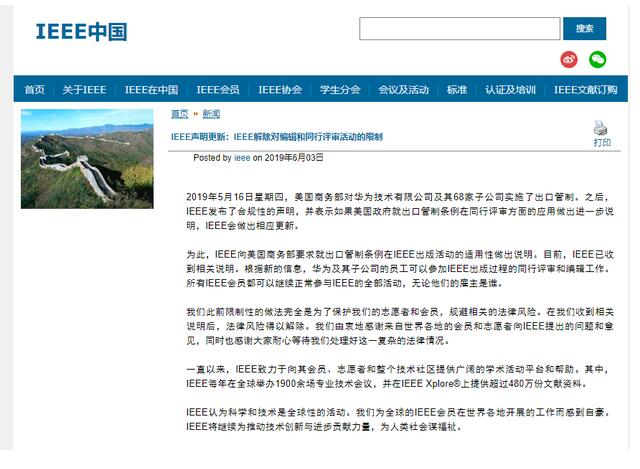 2019年5月16日星期四,美国商务部对华为技术有限公司及其68家子公司实施了出口管制。之后,IEEE发布了合规性的声明,并表示如果美国政府就出口管制条例在同行评审方面的应用做出进一步说明,IEEE会做出相应更新。