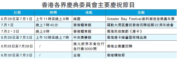 【香港商報网訊】記者何加祺報道:為慶祝國慶70周年及香港回歸祖國22周年,香港各界慶典委員會今年將舉辦多項大型慶祝活動,當中包括將在6月29日至7月1日在維園舉辦「Greater Bay Festival創科潮流音樂嘉年華」、7月1日在香港體育館舉辦「躍動大灣區慶祝香港回歸祖國22周年晚會」等(見附表)。慶委會署理執行主席陳勇表示,為配合粵港澳大灣區建設,積極推動香港融入國家發展大局,慶委會今年在回歸日前後會舉辦一系列以大灣區和創科為重點的慶祝活動,預計會有30萬人次參與活動。