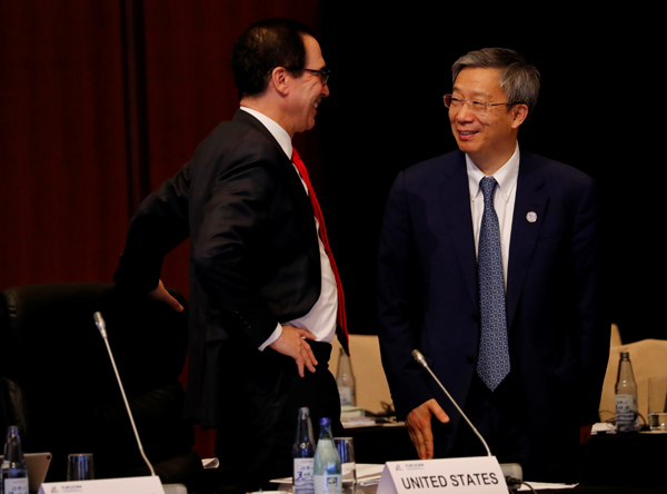美國財政部長鉧欽與中國央行行長易綱(右)在G20財長和央行行長會議上交談。路透社