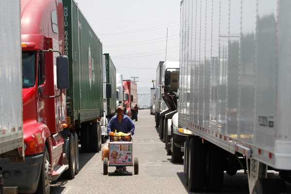 當地時間7日,貨車在墨西哥邊境城市蒂華納排隊等待過境進入美國。 路透社