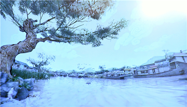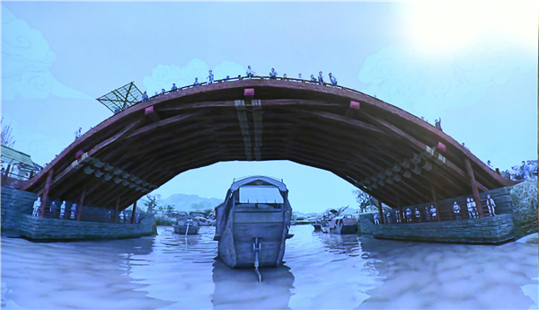 至於「汴河碼頭」球幕影院的180度影片,採用了一鏡到底的技術,描繪汴河從白天到傍晚的生動景象,更可讓參觀者置身其中,彷彿正坐在船上行駛在《清明上河圖》的汴河上。