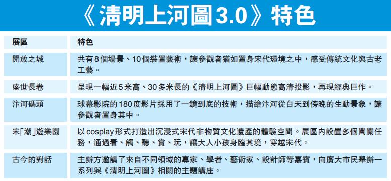 是次展覽是《清明上河圖3.0》高科技互動藝術展演走出故宮的第一站,由「開放之城」《清明上河圖》之旅、「盛世長卷」巨幅動態高清投影、「汴河碼頭」180度球幕影院、「宋『潮』遊樂園」親子民藝體驗空間等部分組成,緊密融合藝術、文化與科技元素,將原作細節和相關歷史背景進行數碼化轉譯。「開放之城」及「宋『潮』遊樂園」首次在香港亮相。