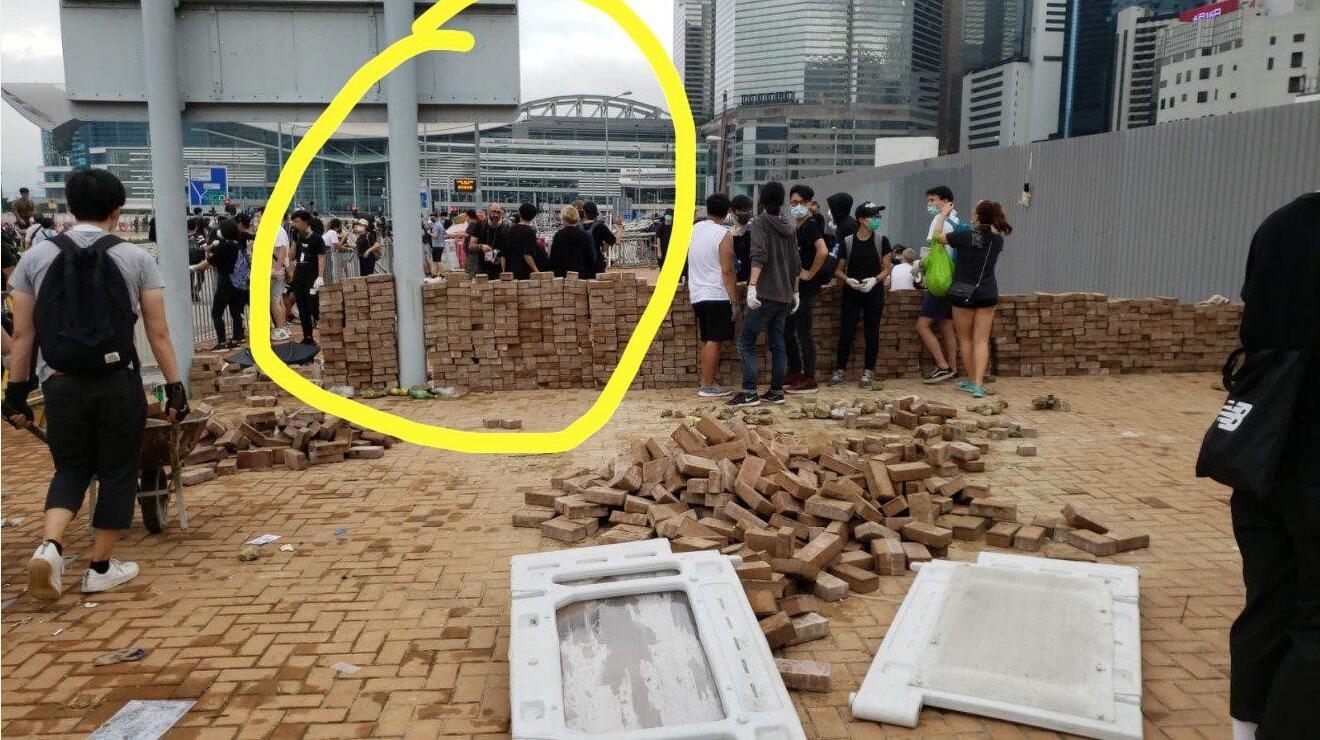 另一方面,大批戴上口罩的年輕示威者在龍和道及立法會道撬出大批地磚砌出磚牆,部分路邊圍欄被拆走。期間見到多名穿黑T恤的金髮外籍人士在旁指指點點,似是「教路」。另外,有示威者拿走附近工程用的鐵枝,再合力將鐵枝運送到他們聚集的地方。警方見狀隨即警告示威者切勿投擲磚頭,因此舉可能會嚴重傷害他人身體,甚至致命,是嚴重違法行為。