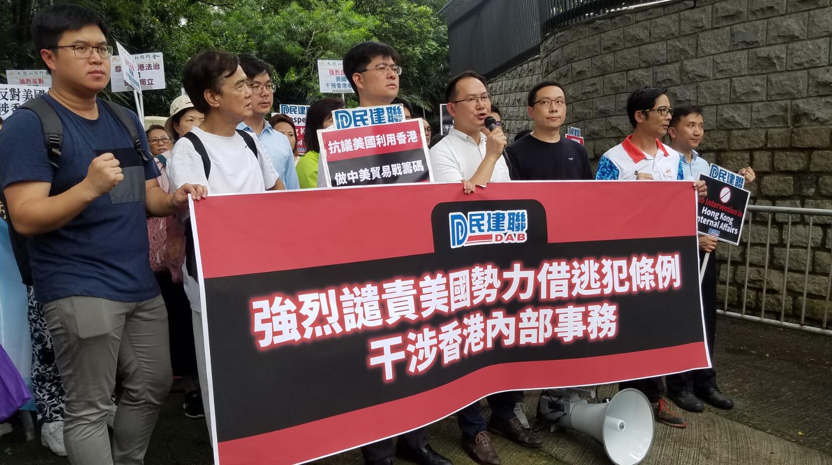 民建聯約30人昨日遊行到美國駐香港總領事館抗議,他們高叫口號「抗議美國利用香港」、「強烈譴責美國勢力借逃犯條例、干涉香港內部事務」等。他們表示,美國當局近期不斷發表干預香港內部事務的言論,引起廣大市民的強烈不滿和反對,對此表示極度遺憾。他們又指,相信這亦是香港與美國當年簽訂移交逃犯協議的共同目的,惟美國現在卻發表罔顧事實的言論,不單製造包庇逃犯的效果,亦粗暴干涉香港內部事務,令人憤慨。