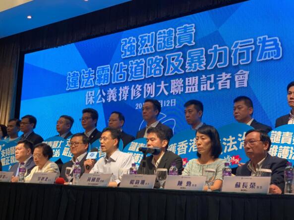 【香港商報網訊】記者周偉立報道:金鐘一帶昨日發生大型騷亂,「保公義撐修例大聯盟」昨日下午舉行記者會,強烈譴責香港近日出現的暴力恐嚇及衝擊等違法行為,批評香港社會有少數人與外部勢力互相勾結,鼓動年輕人暴力衝擊立法會,甚至發起罷工、罷課、違法霸佔道路、堵塞交通等激進違法行為,呼籲所有對修訂《逃犯條例》持不同意見人士,以理性、和平、合法的方式來表達,求同存異,達成共識。