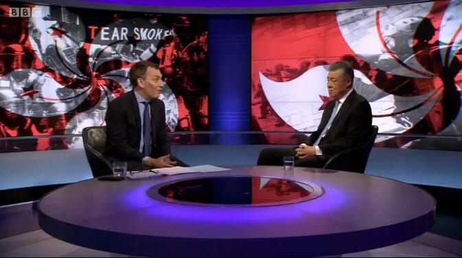 2019年6月12日,中国驻英国大使刘晓明接受英国广播公司(BBC)《新闻之夜》栏目主持人马克·厄本直播专访,就涉香港、新疆、华为等问题阐述中国立场,回答提问。