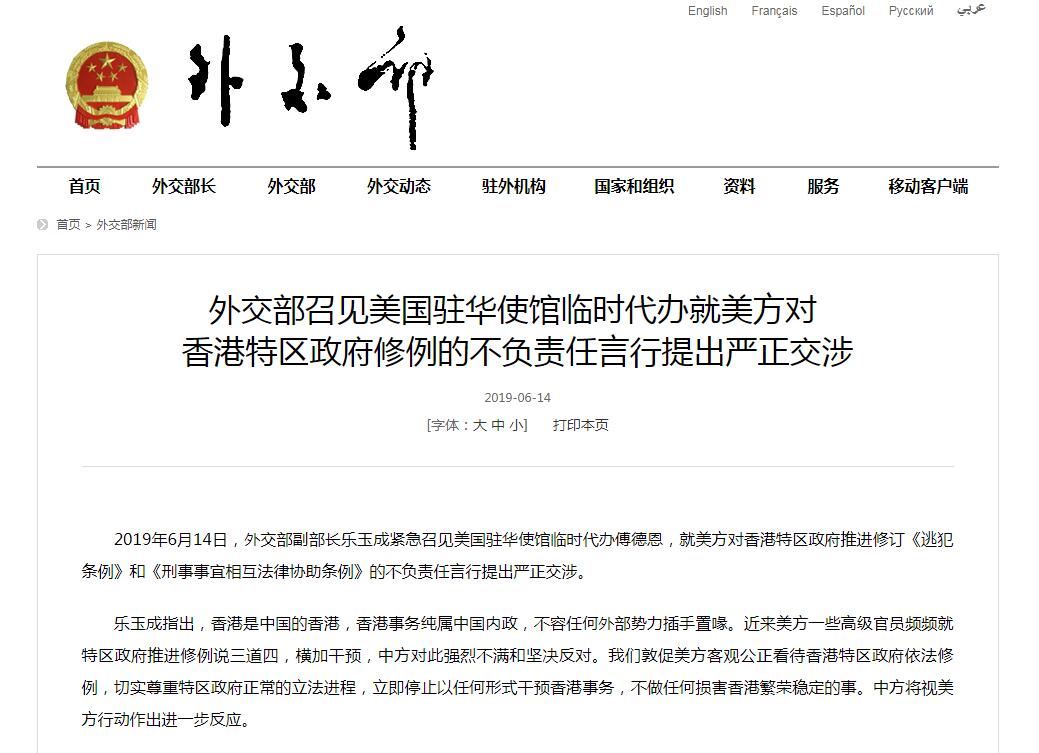 2019年6月14日,外交部副部長樂玉成緊急召見美國駐華使館臨時代辦傅德恩,就美方對香港特區政府推進修訂《逃犯條例》和《刑事事宜相互法律協助條例》的不負責任言行提出嚴正交涉。