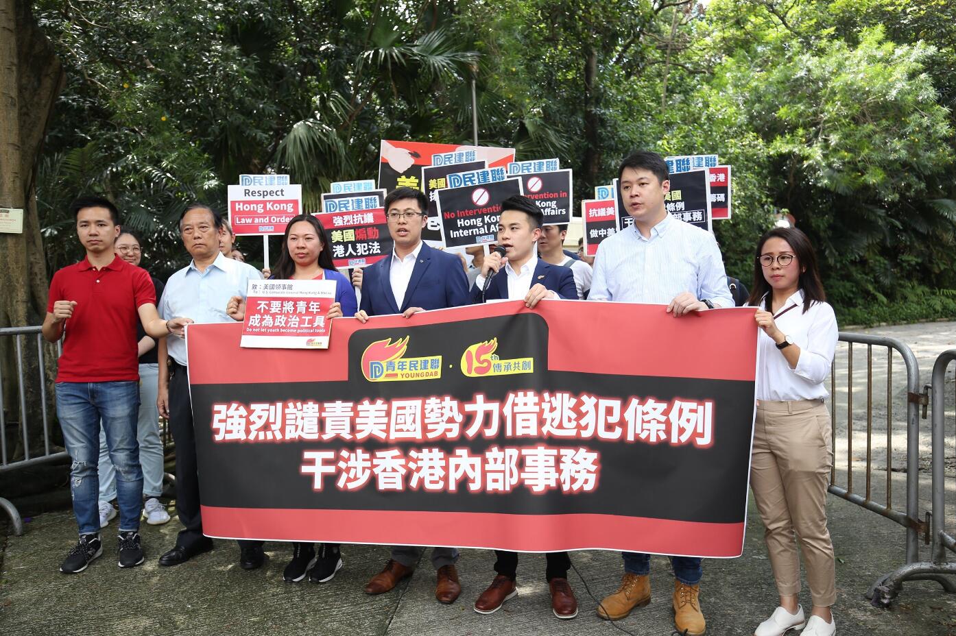 青年民建聯10餘名成員昨日到美國駐港澳領事館拉起橫額,抗議美國干預香港事務,指美國當局近期不斷發表偏頗及誤導性言論,歪曲香港修訂《逃犯條例》的合法性及正當性,藉此煽動青年人,令他們產生誤解而反對修訂《逃犯條例》。青年民建聯對於美國的不負責任言論,干預香港內部事務,甚至誤導香港青年參與違法活動,表示極度不滿。