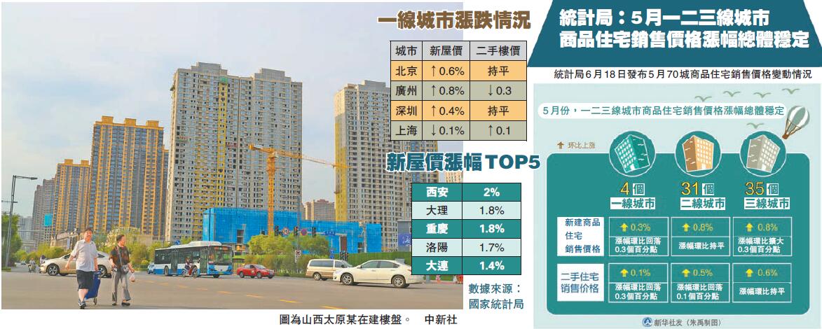 在開發投資、銷售增速小幅回落的同時,5月份中國70個大中城市房價漲幅趨穩。國家統計局昨日發布的數據顯示,5月有67個城市新建商品住宅價格環比上漲,數量與上月持平。其中,西安環比增幅最大,漲幅為2%。一線城市中,北京、廣州和深圳分別上漲0.6%、0.8%和0.4%,上海下降0.1%。