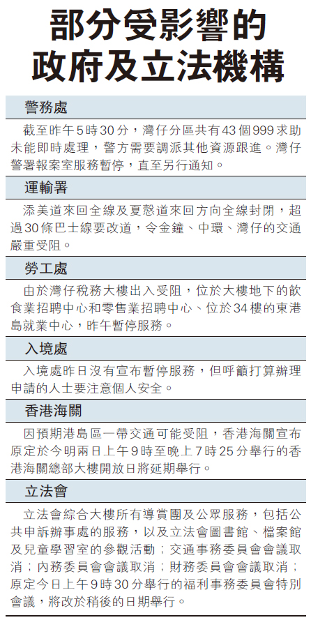 反對派圍堵公共設施的行動,影響多項公共服務,如警務處的999求助服務受到阻延,截至下午5時30分,灣仔分區共有43個999求助未能即時處理。示威者昨晚仍然佔據金鐘夏慤道來回行車線,而灣仔告士打道亦因為示威者設置路障,無法通車。