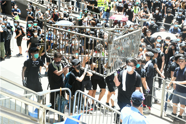 示威者搬起鐵欄柵堵塞警總出入口。攝影:香港商報記者馮瀚文