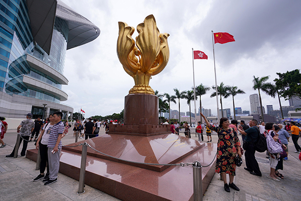 受連日遊行集會和衝突事件影響,來港內地旅行團減少。旅遊業議會期望事件盡快平息,讓旅遊業重回正軌。圖為內地遊客在香港金紫荊廣場拍照留念。中通社