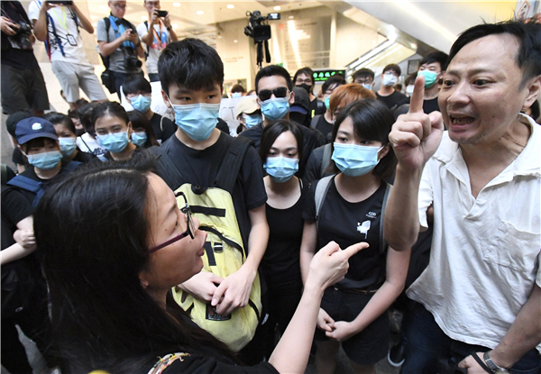 有示威者昨日堵塞並佔據稅務大樓,令市民職員出入受阻。圖為受阻市民與示威者理論。中通社