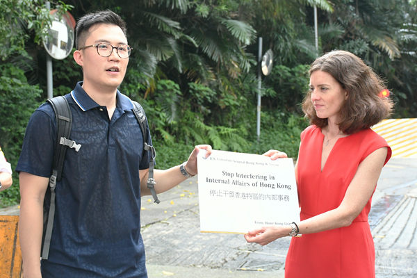 【香港商报网訊】一批高舉國旗及區旗的市民,今日遊行到多個外國駐港總領事館請願,反對外國干預香港事務,同時批評美國別有用心。