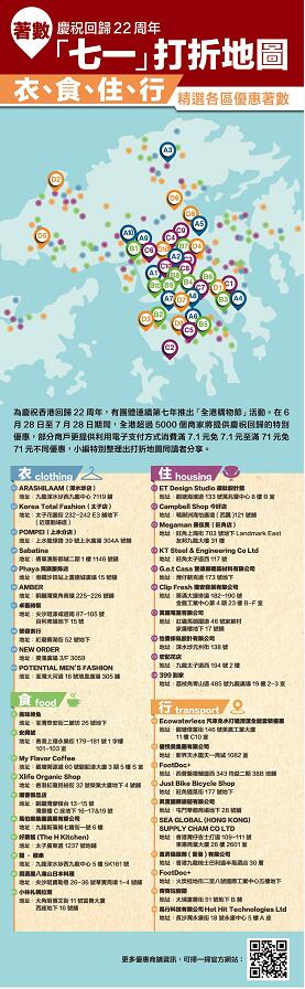 【香港商报网讯】为庆祝香港回归22周年,有团体连续第7年推出“全港购物节”活动,在6月28日至7月28日期间,全港超过5000个商家将提供庆祝回归的特别优惠,部分商户更提供利用电子支付满7.1元免7.1元至满71元免71元的不同优惠。请看小编制作的香港“七一”打折地图。
