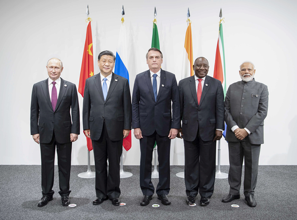 金磚國家領導人會晤昨日在大阪舉行。國家主席習近平、巴西總統博索納羅、俄羅斯總統普京、印度總理莫迪、南非總統拉馬福薩出席。五國領導人圍繞金磚夥伴關係、全球治理、科技創新合作等深入交換意見,達成廣泛共識。金磚國家機制輪值主席國巴西總統博索納羅主持會晤。