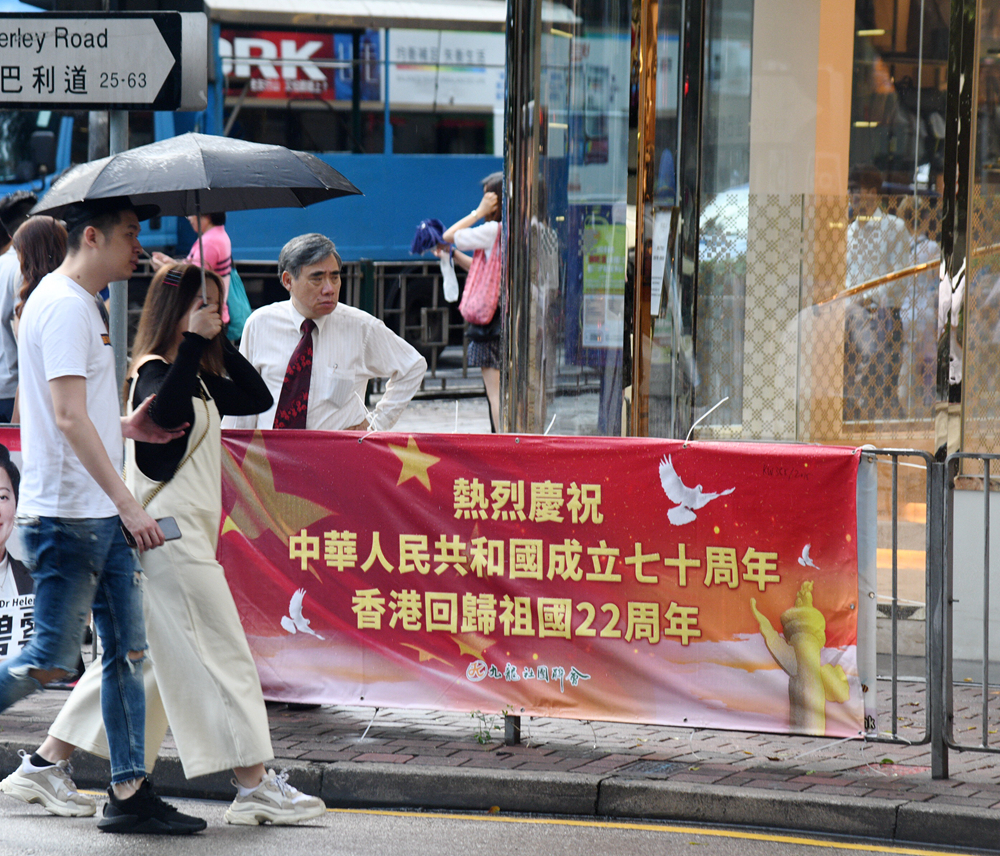 【香港商報网訊】記者周偉立報道:適逢新中國成立70周年及香港回歸祖國22周年的重要時刻,全港各界均以不同方式熱烈慶祝,普天同慶。維港兩岸多幢標誌性大廈的巨型戶外屏幕,不斷循環播出「熱烈慶祝香港回歸祖國22周年」的字句及視頻,多幢大廈也掛出五星紅旗和香港區旗慶祝。在街頭,各政團的慶回歸宣傳橫額同樣遍地開花,全城洋溢濃厚的歡樂氣氛。