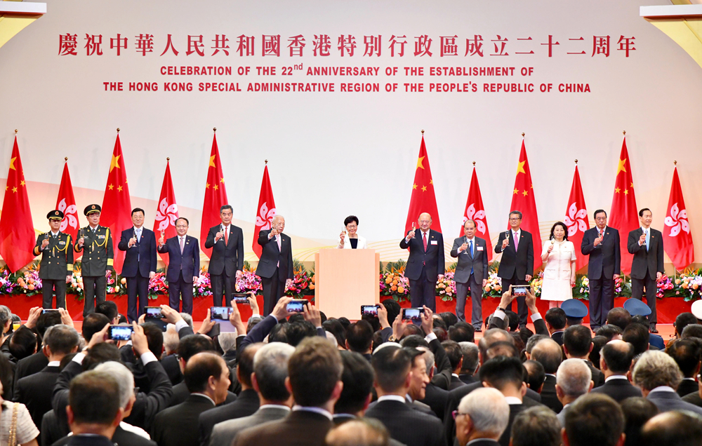 林鄭月娥於酒會致辭時指出,回歸22年來,香港的政治、經濟、社會等各方面雖然經歷不少變遷、起跌,但總體而言,香港保持繁榮穩定,在「一國兩製」下繼續發揮「背靠祖國、面向世界」的獨特優勢。在「一國兩製」之下,香港受惠於國家改革開放,在社會、經濟和民生各領域得到更加大的發展和增長空間;在「兩製」之上,香港回歸後仍然是世界公認最自由的經濟體之一,《基本法》充分保障港人的基本權利和自由。