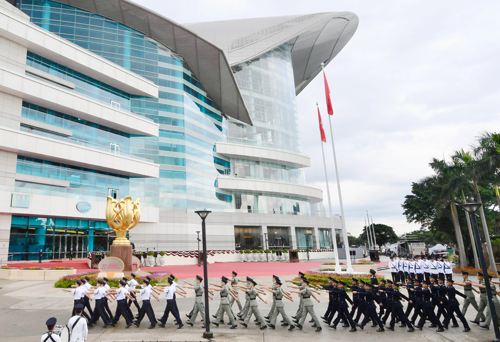 當天早些時候,特區政府宣布,因天氣原因,升旗儀式改以「雨天方案」進行。全國政協副主席董建華、梁振英,香港特別行政區行政長官林鄭月娥,中央政府駐港聯絡辦主任王誌民,外交部駐港特派員公署特派員謝鋒,解放軍駐香港部隊司令員陳道祥等在會展中心內透過電視直播畫面共同見證莊嚴時刻。