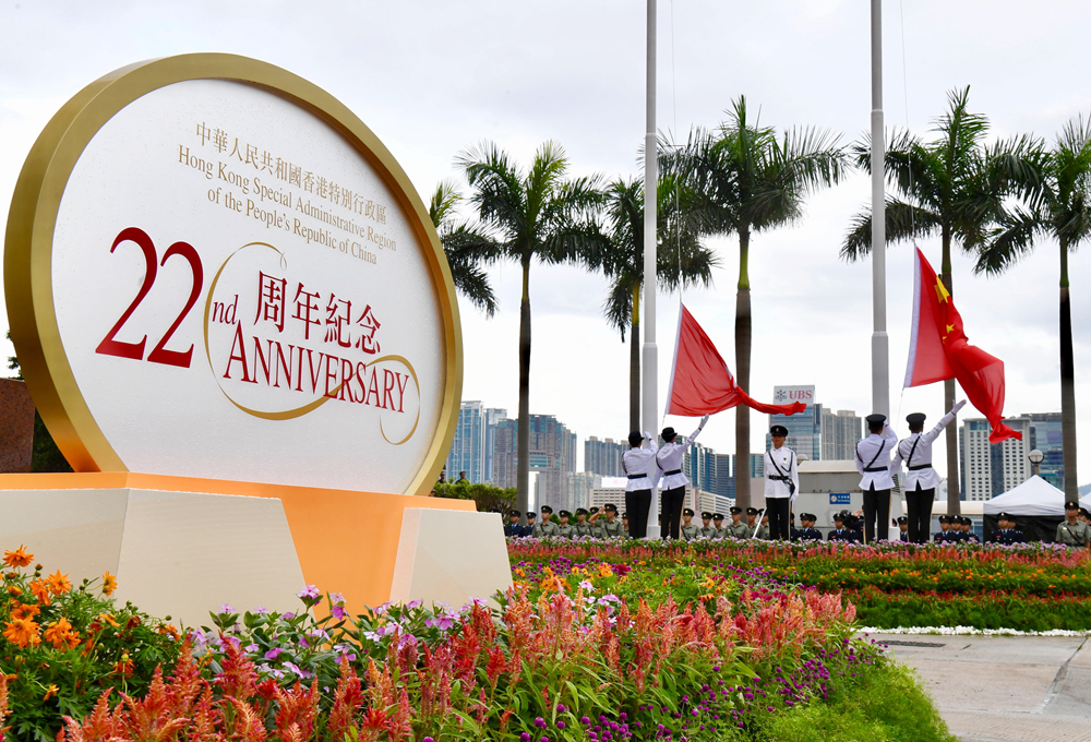 上午8時許,《義勇軍進行曲》奏響,全場同唱國歌,在國歌聲中,五星紅旗和洋紫荊區旗緩緩升至旗杆頂點,迎風飄揚。隨後,政府飛行服務隊直升機懸掛國旗和區旗從維港上空飛過;香港紀律部隊警輪駛過金紫荊廣場旁,噴出巨大水花,灑入維港。隨即,會展中心內舉行慶祝回歸酒會,現場嘉賓共同為香港特區成立22周年祝酒。