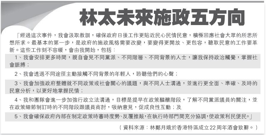 行政長官林鄭月娥昨日列出5項工作,表示會汲取教訓,確保日後施政更貼近民心、民意、民情。對此,本港社會各界均表示認同及支持,希望大家能夠向前看,讓香港重新出發。多位問責官員在出席回歸酒會後亦表示,整個公務員團隊都會繼續努力,讓政府工作做得更好。