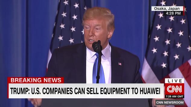 G20大阪峰会6月29日闭幕后,特朗普在记者会上称,美国卖给华为的产品“数量巨大”,美国企业对无法把产品卖出去“感到相当不满”,美国公司可以继续将“不涉及重大国家紧急问题的设备”卖给华为。