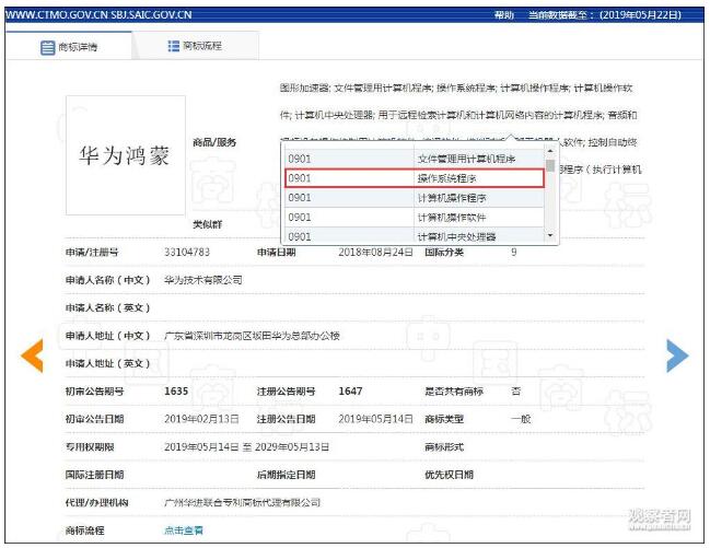 华为在中国注册的商标图自国家知识产权局商标局网站