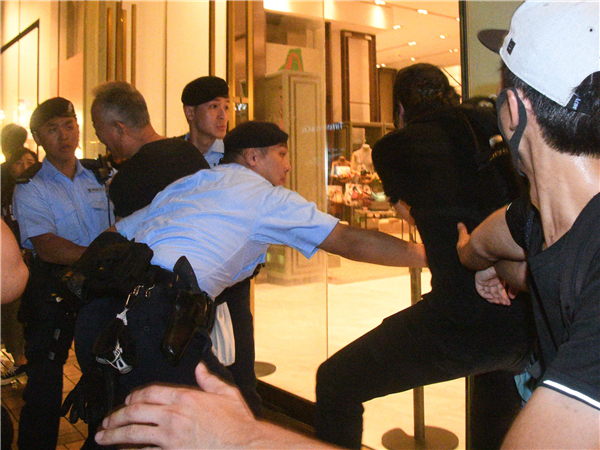 前天夜間,穿黑衣及口罩蒙面示威者圍堵廣東道,有人更企圖衝入店舖,被警員及時制止。