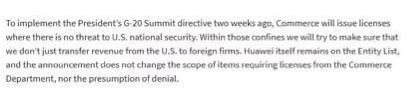 美国商务部官方网站也确认了此事。在该网站刊登的一份发言稿中,美国商务部部长罗斯表示他将给那些“不会对美国国家安全构成威胁”的与华为的生意颁发许可,并称此举是为了落实两周前美国总统特朗普在日本大阪G20峰会上对中方做出的承诺。