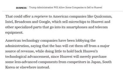 《纽约时报》还表示,美国的科技公司其实一直都在游说特朗普政府,希望放宽对华为的限制,因为这些限制不仅会导致这些美国企业失去一个主要的营收来源,而且也不会阻碍华为的发展,毕竟华为还可以从日本或韩国等美国企业的竞争对手那里购买替代产品。