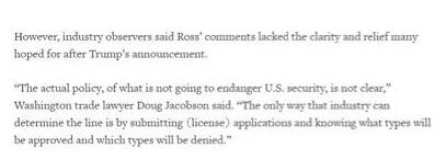 但从英国路透社的报道来看,不少美国企业和业内观察人士仍对美国商务部的这一最新表态持观望态度,因为美国商务部并没有明确地表示什么样的交易才不会对美国的国家安全构成威胁。
