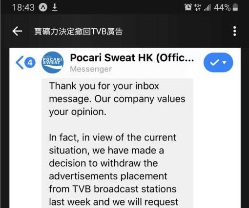 據網傳的訊息截圖顯示,寶礦力香港官方專頁經Facebook Messager回覆客戶查詢,表示鑑於目前社會情況,上周已決定抽起公司所有在無綫的廣告,料過程需時約2周。