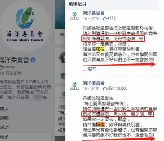 作为台当局海洋政策机构,台“海委会”在16日在社交网站“脸书”发布一则台风警告文章,但文章却用讽刺语气称:“请勿到海边做一些挑战生命极限的蠢事,例如海边观浪、泛舟或冲浪...等。”